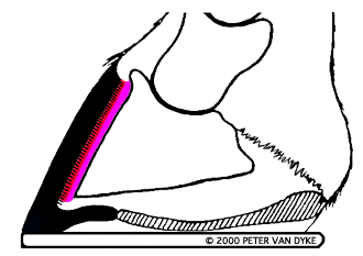 As non inflammatory processes that affect the hoof/bone bond become better understood we expect that this will impact the use of the term founder, more so than the term laminitis. Laminitis, the inflammatory condition, is around to stay. But founder, now so closely associated with laminitis, will likely be shown to have non-inflammatory influences either precipitating or contributing significantly to it. We anticipate the addition of new terms which will describe these conditions more accurately. It is our hope that each new term and description will serve to clarify the horse owner's understanding of "laminitis" rather than to further confuse and confound. We are concerned, however, that new terms and descriptions of obscure conditions affecting the hoof/bone bond may eclipse descriptions of diseases more likely to effect the general horse population. The laminitis most familiar to horse owners will not simply disappear in light of newly discovered hoof pathologies. We expect that the reason why some horses "sink" rather than "rotate" is likely to be explained by these new findings. We prefer to think in terms of hoof/bone bond disease. Currently we identify three hoof/bond disease categories, by location (or tissue type). Horny (White Line Disease, Seedy Toe, etc.), lamellar (inflammatory and non inflammatory), connective tissue (inflammatory and non inflammatory). Each of these, of course, have their own etiology. It is not our intention to diminish the importance of understanding the particular pathology affecting an individual horse. However, we do want to demonstrate an effective therapy for ALL the conditions threatening the hoof/bone bond, regardless of their pathogenesis. This therapy consists of the application of hardware (some form of "shoe") providing alternate boney column support and the removal of the diseased tissues, collectively referred to as the Chapman Procedure.