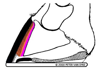 Because the lamellar space in the heel region is NOT similarly restricted in its capacity to expand (lateral cartilage, thinner shorter hoof wall, etc.) the lamellar bond is here faces a lesser challenge. For this reason, and others, when the lamellar bond is finally destroyed in the toe region "rotation" is produced. The heels maintain their bond while the toe does not. The sensitive laminae, now devoid of blood (orange area above) have stretched. It is important to understand that the swelling taking place is of an hydraulic nature. Resistance is futile. The dorsal aspect of P3 will be forced apart from the hoof wall at the toe by hydraulic pressure alone. Neither gravity nor deep digital flexor tendon tension are REQUIRED to produce rotation. Nor will sustained P3 support without resection offer comfort.
